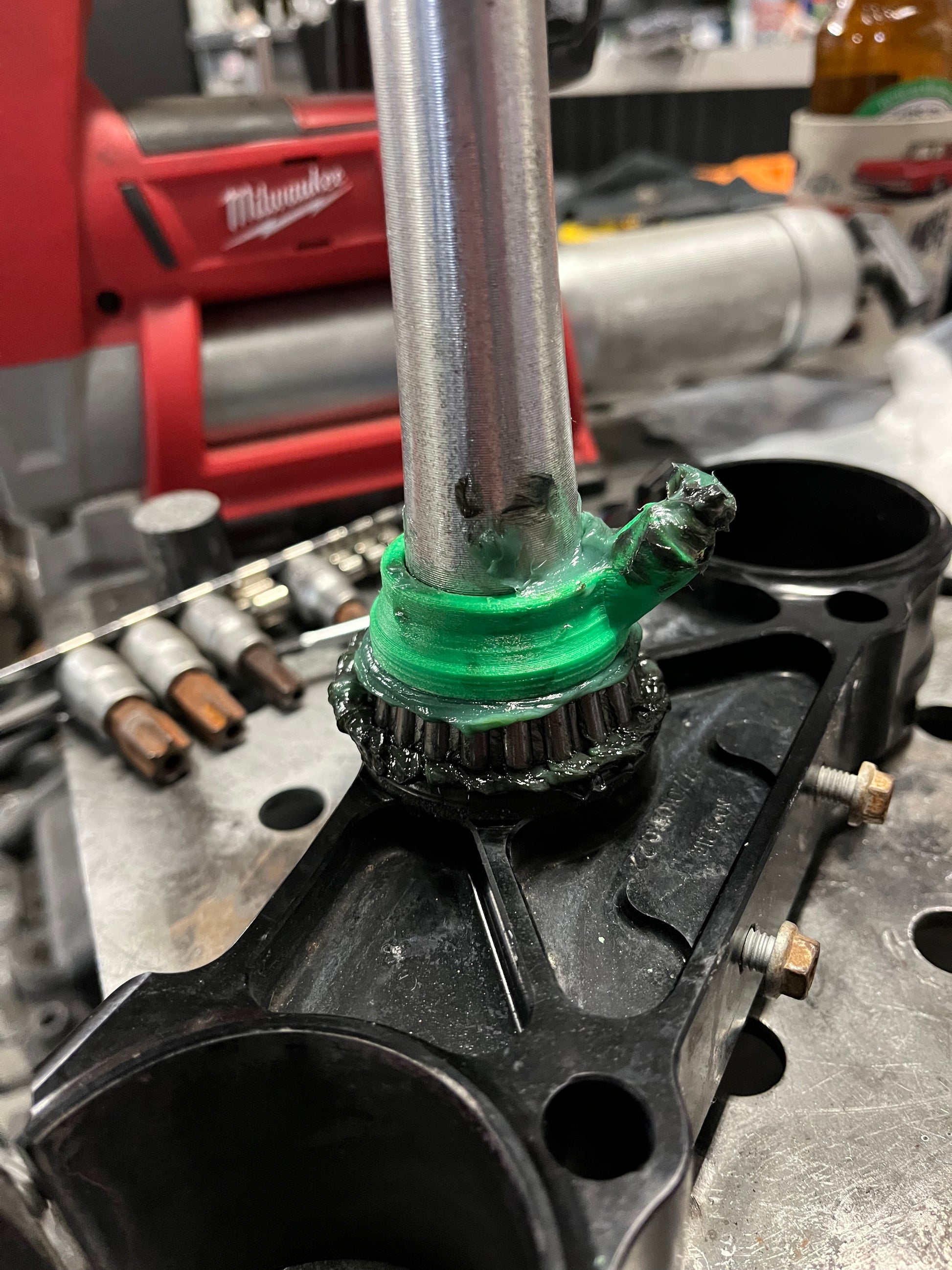 Greasing tool for greasing headstem steering head bearings on new euro bikes with a headstem diameter of 29mm. Top bearing can be greased on the supplied post, bottom bearing can be greased on the triple clamp.